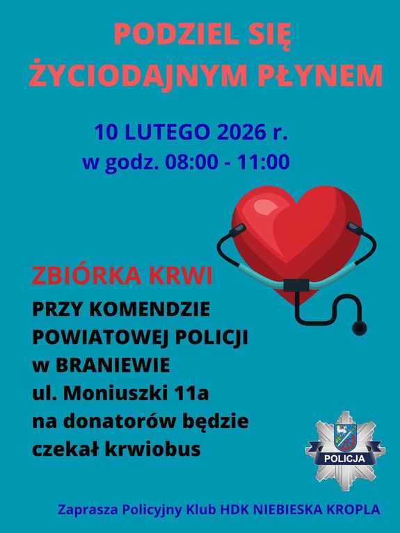 Już niedługo - we wtorek (10.02.2026 r.) odbędzie się pierwsza w tym roku akcja krwiodawstwa w mobilnym punkcie przy braniewskiej komendzie Policji. Bądź tam razem z nami i pomóż tym, którzy tak bardzo potrzebują Twojej krwi.
