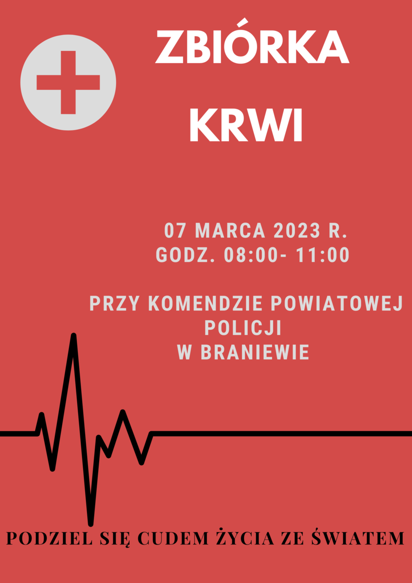 Liczymy na Twoja obecność. Zapraszamy wszystkich już 07 marca 2023r. od godziny 8:00 przed budynek Komendy Powiatowej Policji w Braniewie, przy ul. Moniuszki 11a, gdzie na donatorów będzie czekał krwiobus.