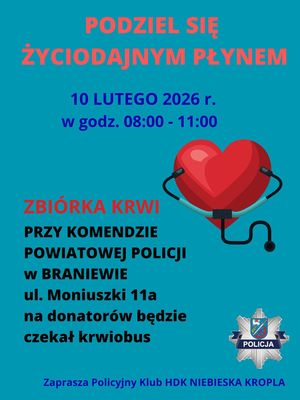 Zapraszamy wszystkich już 10 lutego 2026 r. od godz. 8:00 przed budynek Komendy Powiatowej Policji w Braniewie, przy ul. Moniuszki 11a, gdzie na donatorów będzie czekał krwiobus.