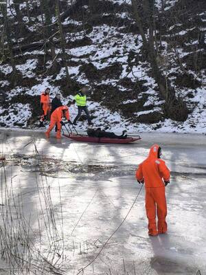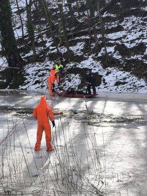 W tym czasie dobiegł asp.sztab. Paweł Kutryb, który również położył się na zamarzniętą taflę lodu i czołgał się do poszkodowanych. Rzucił rzutkę ratowniczą i obwiązał linką nogę tonącego mężczyzny (resztkami sił udało mu się wystawić nogę ponad lód).