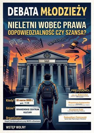 Wczoraj (26.03.2026 r.) w sali kinowej Braniewskiego Centrum Kultury odbyła się debata społeczna organizowana przez Zespół Interdyscyplinarny przy MOPS Braniewo, którego jednym z członków jest również przedstawiciel Policji. Debata odbyła się pod nazwą "Nieletni wobec prawa – odpowiedzialność czy szansa?” i dedykowana była do młodzieży braniewskich szkół ponadpodstawowych.