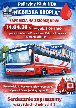 Dlatego kolejny raz wspólnie z Regionalnym Centrum Krwiodawstwa i Krwiolecznictwa zachęcamy do oddawania krwi. Zbiórka krwi zostanie przeprowadzona 14 kwietnia (wtorek) w godz.8.00-11.00 na parkingu przed komendą Policji przy ul. Moniuszki 11a w Braniewie