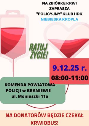 Policyjny Klub HDK " NIEBIESKA KROPLA" zaprasza na ostatnią już w tym roku zbiórkę krwi! We wtorek 9 grudnia od godz. 08:00 do 11:00 przed budynkiem Komendy Powiatowej Policji w Braniewie na donatorów będzie czekał krwiobus. Serdecznie zapraszamy wszystkich chętnych — zabierz znajomych, rodzinę, sąsiada!
